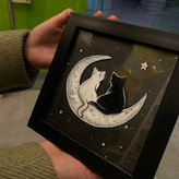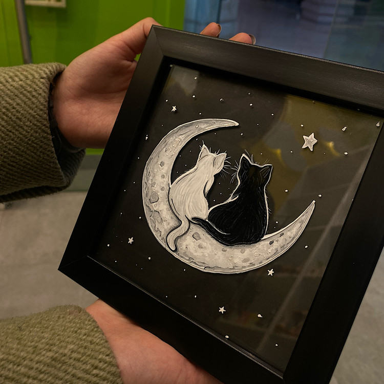 این تابلو فانتزی و رمانتیک، تصویری از دو گربهی سفید و سیاه است که بر روی هلال ماه نشستهاند و به ستارهها خیره شدهاند. ترکیب رنگهای سیاه و سفید در پسزمینهای تاریک، حس آرامش و عشق را منتقل میکند.