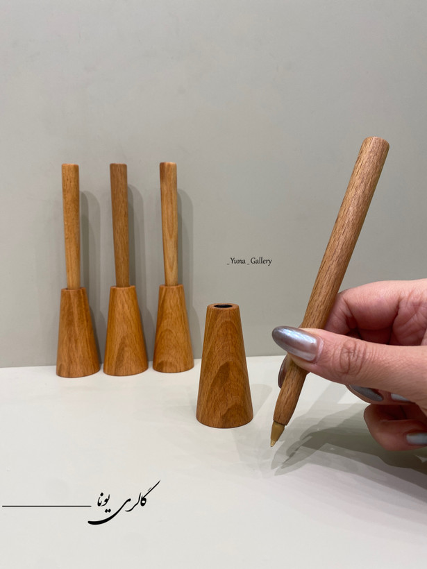 هر خودکار همراه با یک استند چوبی مخروطی شکل ارائه میشود؛ استندی که علاوه بر زیبایی، روی میز کار یا تحریر جلوهای منظم و حرفهای ایجاد میکند. این پایهها نیز از همان چوب باکیفیت راش ساخته شدهاند و هماهنگی کاملی با بدنهی خودکار دارند.