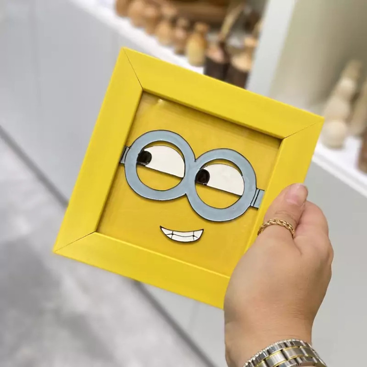 تابلو طرح مینیون با قاب و پس زمینه زرد طرح روی شیشه کارشده است به صورت برجسته